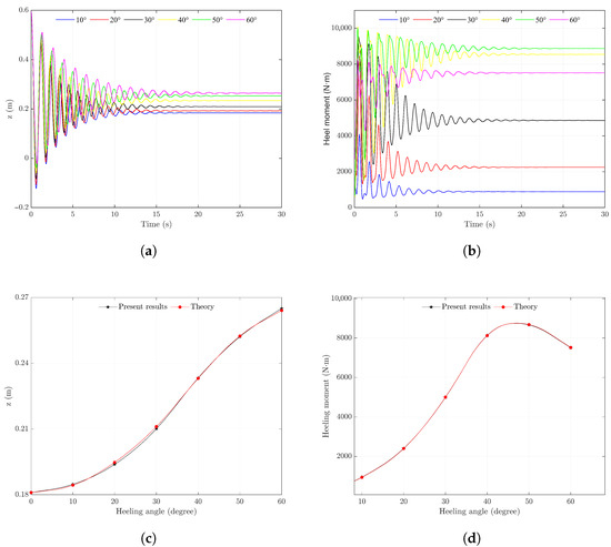 The height of the center of mass of the quasi-hull above the water surface, along with the corresponding heeling moment, is calculated at heel angles of 10°, 20°, 30°, 40°, 50°, and 60°. The theoretical values are derived using centroid calculations, quadrilateral area formulas, and linear equations. The resulting motion curves under the gradient pressure method at each specified heel angle are shown in Figure 8a,b. It can be observed that both the vertical displacement and the heeling moment of the quasi-hull rapidly converge to stable values. As shown in Figure 8c,d, a comparison between the numerical and theoretical solutions demonstrates close agreement, confirming the accuracy of the gradient pressure method.