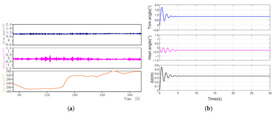The validation of the gradient pressure method for helicopters equipped with flexible airbags is conducted using the experimental results from Wang [13]. The experimental model used is consistent with the one described in Section 3 of this paper. The tests were carried out at the High-Speed Hydrodynamics Laboratory of the China Special Aircraft Research Institute and included both free-floating and static-stability tests. In the free-floating test, a balance was installed on the helicopter to measure the equilibrium longitudinal inclination angle, roll (heel) angle, and pitch angle in still water, as illustrated in Figure 9a. Figure 9b presents the time history curves of these parameters as calculated using the gradient pressure method. A comparison with experimental data shows that the computed heel and longitudinal inclination angles closely match the measured values, with errors of less than 10 percent.