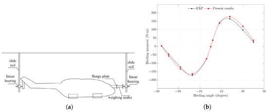 Figure 10a shows a schematic diagram of the static-stability test device. The helicopter model is installed on the lower part of the hydrodynamic test trailer. A flange is installed at the nose along the central longitudinal axis. The flange can adjust the model’s roll angle. One side of the balance is connected to the model through the flange, and the other side is connected to the linear bearing. The linear bearing and the slide rail form a set of motion mechanisms to ensure that the model can move freely along the vertical direction, and the movement in other directions is constrained. The tail linear bearing is fixed to the model along the longitudinal axis of the center of gravity and forms a set of motion mechanisms with the slide rail. The function is the same as the head motion structure. The slide rail is fixed to the trailer. During the test, the roll angle of the model is given by the flange. After the model and the balance are stable, the roll moment of the model is measured. Then, under a series of roll angles, the roll moment curve with the roll angle is obtained. Figure 10b shows the comparison curve of the test results and the static-stability results of this model under the gradient pressure method. The results of the two are similar. Among them, due to the influence of the quality of the test device itself, the test results will be slightly smaller than the numerical calculation results of the gradient pressure method.