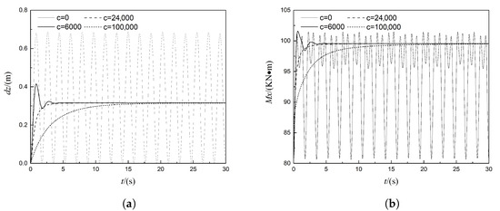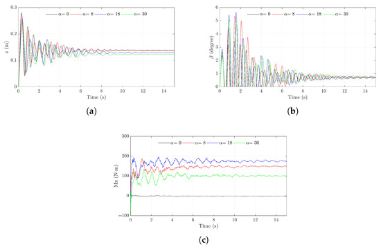 Time history curve of the helicopter parameters: (a) Z displacement of the helicopter’s center of gravity; (b) pitch angle; (c) heeling moment.