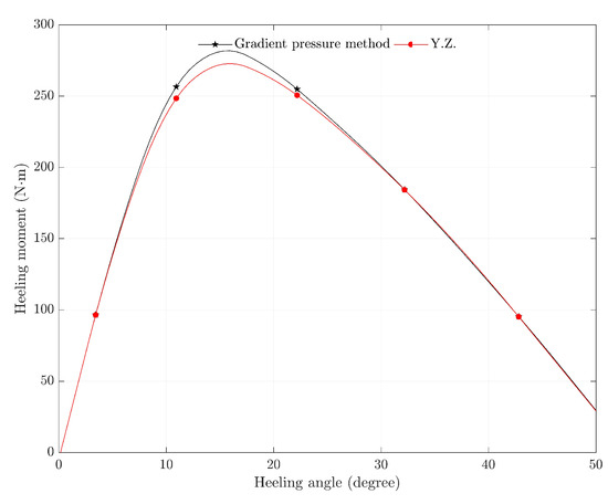 When the heeling angle exceeds , the static-stability moment of the helicopter gradually decreases with increasing heeling angle. At this stage, the center of mass of the helicopter moves closer to the water surface, and the waterline rises accordingly. As a result, the centroid of the displaced volume gradually approaches the geometric center of the helicopter and moves closer to the center of mass. Consequently, the lateral arm between the buoyant force and the gravitational force decreases, leading to a reduction in the static-stability moment.