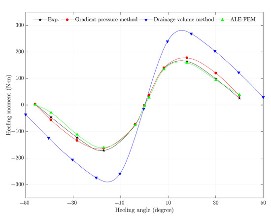 Figure 14 shows the heeling moment at different heel angles. Similar to the static-stability curve of the pure rigid model discussed in the previous section, the helicopter’s lateral static-stability moment is not zero at a heeling angle of due to a offset between the center of mass and the centroid in the y-direction. Within the small heeling angle range, the curve obtained using the drainage volume method closely resembles the static-stability results of the pure rigid model, displaying a proportional relationship between the heeling moment and heeling angle. In contrast, the results from the experiment, ALE-FEM simulation, and the gradient pressure method deviate from linearity in this range. This difference arises because even under small heeling angles, the airbags possess vertical and rotational degrees of freedom relative to the helicopter. Consequently, after the system reaches equilibrium, the airbags tend to maintain a near-horizontal posture, resulting in vertical displacements, drainage volumes, and buoyancy centers similar to those at the roll angle. As a result, the heeling moments differ from those predicted by the rigid-body-based drainage volume method. Additionally, the helicopter reaches a zero heeling moment at lower heeling angles in the experiment, ALE-FEM, and gradient pressure method compared to the drainage volume method. Due to the vertical and lateral degrees of freedom, the airbags are able to move closer to the helicopter’s body. For a given buoyant force, this reduces the moment arm provided by the airbags. Therefore, compared to the rigid model, the effective width of the system’s lower structure is significantly reduced, and the overall buoyancy center coincides with the system’s center of gravity in the y-direction at smaller roll angles.