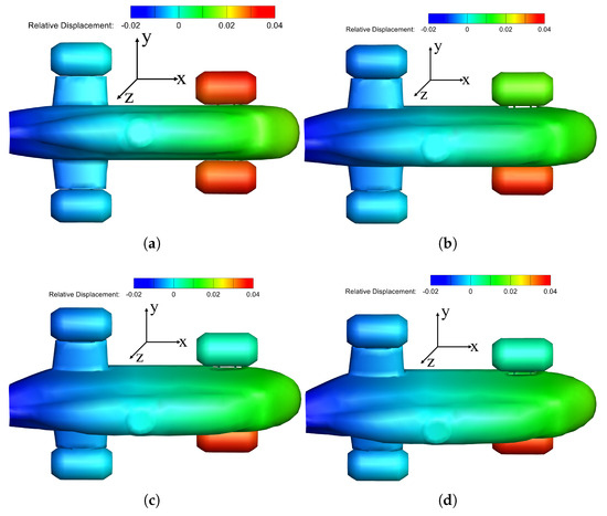 Cloud map of z-direction displacement of relative center of gravity of nodes while helicopter is stable: (a) 0 degrees; (b) 8 degrees; (c) 18 degrees; (d) 30 degrees.