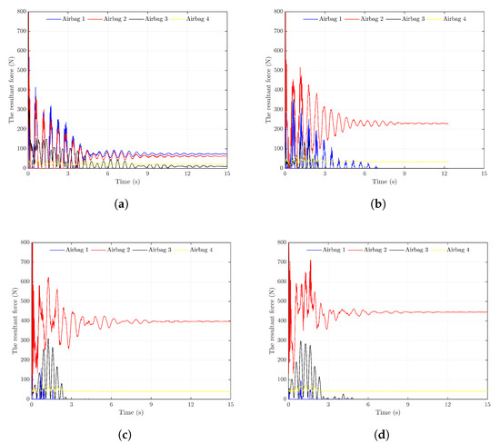 The time history curves of resultant contact forces between the helicopter and each airbag under critical heeling angles: (a) ; (b) ; (c) ; and (d) .