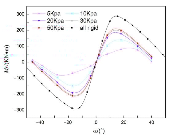 Based on the above conclusions, the variation in lateral static stability of helicopters, which is caused by the flexibility of airbags and connecting straps, is primarily attributed to the elastic behavior of the airbags themselves, specifically the influence of the airbag’s internal pressure. In this section, 5 kPa, 10 kPa, 20 kPa, 30 kPa, and 50 kPa (relative to standard atmospheric pressure) are selected as parameters of airbag internal pressure to analyze the impact of airbag deformation on the lateral static stability of the helicopter.