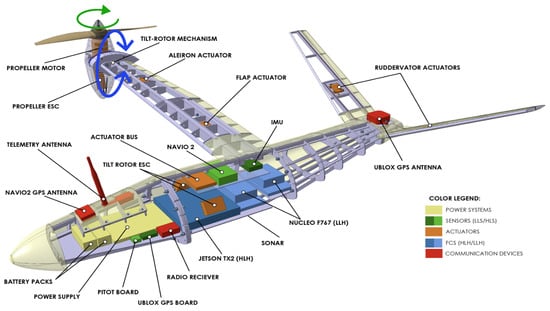 - Pinazo, D. Design of the General Architecture for the Systems Integration, Functional Tests, and Flight Tests Campaigns for a Tilt-Rotor UAV Prototype: Project EMERGENTIA-ProVant; University of Seville: Seville, Spain, 2021. [Google Scholar]