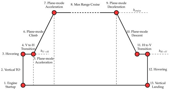 The nominal flight profile under investigation (numbering corresponds with Figure 3) commences with an engine startup lasting (1), with thrust being set to 60% of the aircraft’s total weight. This is followed by a vertical take off spanning two altitudes (2), resulting in a total ascent denoted as . Subsequently, a fixed-point hover of duration (3) simulates in-flight setup prior to transition. The axial to plane-mode flight transition (4) is executed through the tilt-rotor capabilities of the aircraft, concluding when the total speed reaches the minimum operative horizontal speed . The vehicle then accelerates at a constant altitude to the climb speed (5), followed by a fixed-speed climb (6) with a prescribed altitude increment of . This phase is succeeded by second acceleration to cruise speed (7) and a straight and level cruise flight at that constant speed (8), optimized to maximize range for a given battery charge . A plane-mode deceleration (9) precedes the descent, reducing the speed to . The aircraft then descends to a lower flight level specified by (10). A transition from plane mode to axial flight (11) is followed by a hover segment lasting (12). Finally, the vehicle descends vertically using the tilt-rotor capabilities (13), covering a vertical distance determined by .