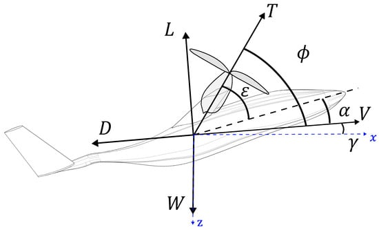 In these equations, x denotes the horizontal position; h the altitude (hence it is ), V the velocity (aerodynamic speed) of the aircraft; is the flight-path (trajectory) angle; T is the total thrust; D and L are the aerodynamic drag and lift forces, respectively; m the mass of the aircraft (assumed constant, since the aircraft’s energy storage system is fully electric); the angle between the engine thrust and the velocity vector; E the energy released by the electrochemical batteries; P the power consumed by the propellers; and is the combined efficiency of all electrical effects (mainly the engine and Electronic Speed Controller or ESC) between the propellers and the battery stacks. The angle can be expressed as the sum of the angle of attack and the engine tilt angle defined as the angle between the thrust vector and the wing-fuselage body reference line. Figure 4 shows a diagram with all forces and angles involved in the performance calculations, where W is the weight ().