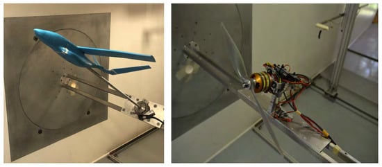 Experimental setup for the wind tunnel test campaign for the aerodynamic (left) and propulsive (right) characterization. These tests provided nonlinear lift, drag, and thrust models as a function of angle of attack and engine tilt, enabling high-fidelity modeling of real-flight behavior in the optimization framework.