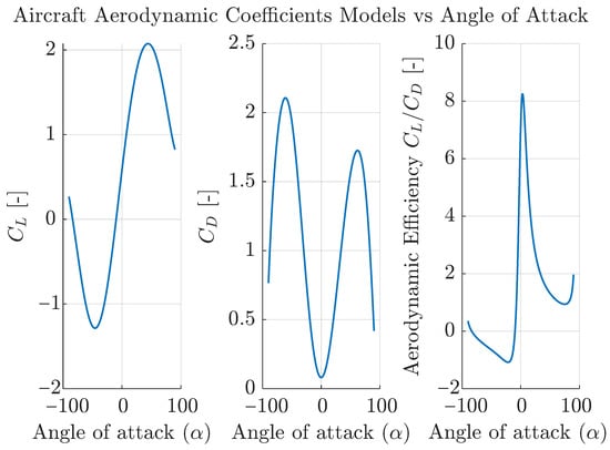 where are the constant coefficients that multiply each term of the angle of attack. For completeness, these coefficients are presented in Table 1, and and are depicted in Figure 6. Moreover, it is standard practice to define a maximum operative lift coefficient by using a safety factor SF, so that . The angle of attack that corresponds to that lift coefficient is called , and the minimum speed that achieves vertical force equilibrium with this angle of attack and no contribution from thrust is defined as .