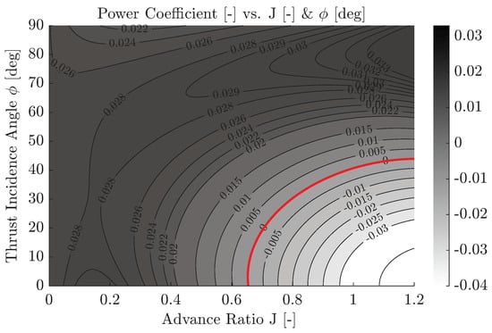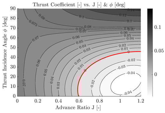 Thrust and power coefficient as functions of the thrust incidence angle and the advance ratio are depicted in Figure 7 as a grayscale heat map. Labeled level curves are also included to ease visualization; the level curve of zero (either zero thrust coefficient or zero power coefficient) is depicted in red. Since the propulsive model is taken as a datum in this paper (and its generation and validation are out of the scope), readers are referred to References [13,15] for a detailed discussion on these results.