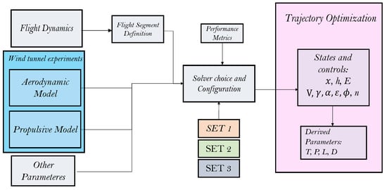 To solve each phase, the flight dynamics are particularized to the requirements of the segment. The aerodynamic and propulsive models, as well as the rest of the parameters to define the aircraft are fed into the solver, which varies with the type of problem encountered. See Figure 8 for a diagram of the process followed. The state and control variables from the flight dynamics model are then extracted for each phase. Following this procedure for each segment defined on Figure 3 completely determines the desired flight profile.