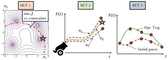 Diagram of the different sets of problems to be solved numerically. Set 1: black solid lines are isolines of the objective function, the red dash-dotted line represents the constraint, and the star is the optimum. Set 2: red dash lines are trayectories not satisfying the final constraint, the green line is the trajectory satisfying the final constraint (depicted as a star). Set 3: the green line is the optimal trajectory and the red dash line is the initial guess trajectory.