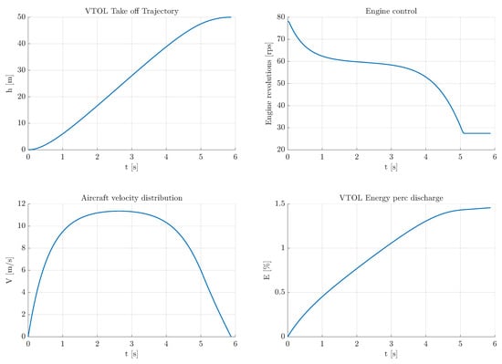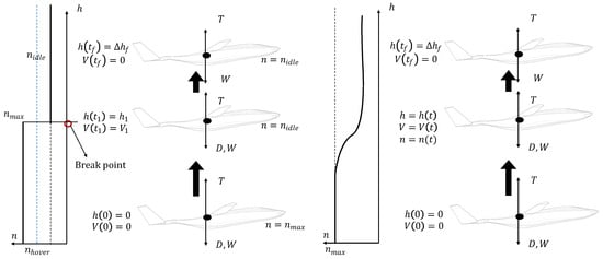 In this initial phase, the aircraft executes a vertical take off (VTO) maneuver to ascend between two specified altitudes separated by a altitude increment . The thrust is aligned with the airflow () and the angle of attack is assumed to be to capture the airflow from above. Under these conditions, the lift is neglected (). The engine speed n remains a control variable, and its evolution over time corresponds to different functional costs, so an optimal evolution of n results in the minimum of this objective function. In this work, the total energy consumption is to be minimized, so the following optimal control problem [27] is formulated:
