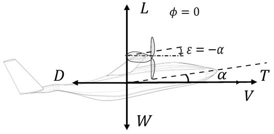 Note that, unless , the propellers are operating with an in-plane component of the airspeed (what in helicopter rotor aerodynamics is referred to as operation in forward flight). In that situation, there might be not only a force perpendicular to the propeller plane but also an in-plane force. Nevertheless, that in-plane force is usually much smaller than the perpendicular force, so in this research the former will be neglected. Therefore, the resulting propeller aerodynamic force (namely, T) is always perpendicular to the propeller, as depicted in Figure 4.