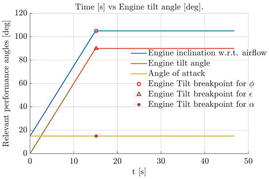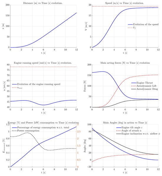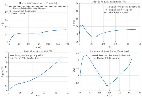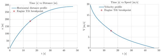 The goal of this phase is to reduce the speed of the aircraft while maintaining a stable altitude. This is performed by changing the inclination of the engines while maintaining a constant angle of attack. Figure 21 shows the evolution of the states x and V over time. The break point depicted stands for the instant the engine reference line is perpendicular to the aircraft reference line (), continuing at that state for the rest of the maneuver. It can be seen how the aircraft lowers its speed at a lower rate as time passes, due to the reduction in aerodynamic drag. Figure 21 also depict the two highly differentiated stages, caused by a change in the imposed evolution in the tilt-rotor angle . It can be seen that the thrust grows as the aircraft’s speed decreases, caused by the imposed time evolution of , which increases over time until it reaches a value of . However, it can be seen from the engine running speed graph that the resulting n gets closer to rps as the speed decreases.