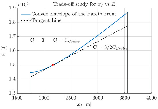 This problem can be formulated as a multi-objective optimization task if the objective function is considered as in two independent terms. On the one side is the energy consumption and in the other is the horizontal distance traveled in the climb segment. The term acts as a weight between both metrics, and Figure 15 represents the convex hull (or convex envelope) of the Pareto front correlating both variables. This set has been calculated solving the climb problem optimizer for a series of values of this coefficient.