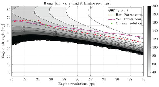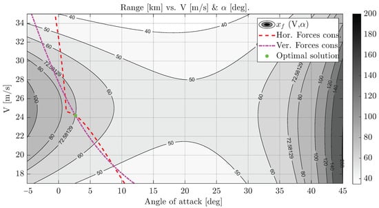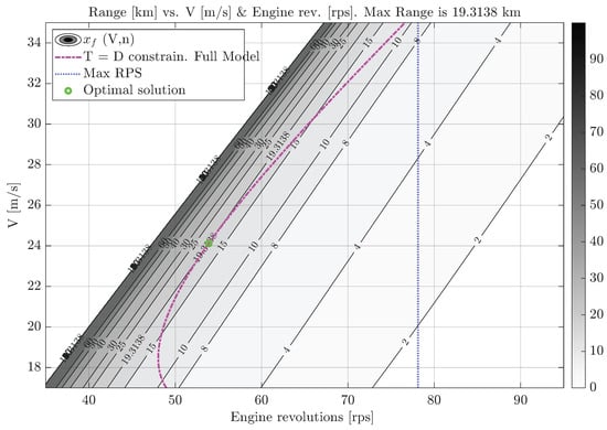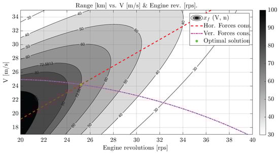 In Figure 20, results corresponding to a cruise constrained to are presented. Specifically, level curves of the aircraft’s range with respect to the varying parameters are depicted, along with the horizontal force constraint, the constraint on maximum engine turning speed, and the optimal solution. Note that, on the one hand, the vertical forces constraint can be used to compute the value of for given values of and, on the other hand, . Hence, the problem becomes much more simple, at the expense of a very substantial loss in energy efficiency (see Table 7).