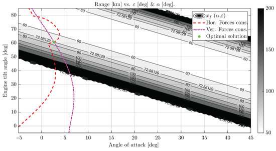 Figure 16, Figure 17, Figure 18 and Figure 19 show level curves of the aircraft’s range with respect to its varying parameters . For representation purposes, this four-variable function is evaluated at section hyperplanes of constant velocity, engine running speed, angle of attack, or engine tilt angle (in pairs of two constant and two varying inputs), at its optimal value, to extract the sensitivity and behavior of this function in the region around its optimal. A feasible solution in these figures is found when the constraints intersect at the same point on the four graphs (its speed value, angle of attack, engine running speed, and engine tilt angle coincide). Every other point would not meet either the vertical or horizontal force equilibrium. From these images we can extract the high non-linearity and non-convexity of the objective function and constrains, which are a result of the complexity of the flight dynamics of the aircraft using a tilt-rotor configuration and experimental models for the propulsive and aerodynamic forces. The superscripted symbol denotes the value of a parameter that optimizes this objective function.