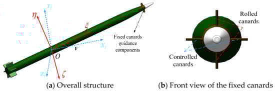 The dual-spin rocket is created by installing a fixed canard guidance component at the warhead position of a conventional uncontrolled rocket (as shown in Figure 1a). During the projectile’s flight, the projectile body and warhead, connected by rolling bearings, rotate independently, forming a dual-spin structure. The projectile structure achieves ballistic control through rolling control of the canards. The fixed canards mechanism is equipped with a total of four canards (as shown in Figure 1b), divided into two pairs, one pair of control canards installed in the same direction and another pair of anti-rotation canards installed in the opposite direction.
