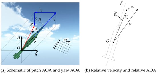 When a projectile flies in a wind field, aerodynamic forces and moments must be calculated using the projectile’s relative velocity to the air and relative angle of attack. As shown in Figure 2b, denotes the wind velocity vector, denotes the relative velocity of the projectile, and is the angle between the relative velocity vector and the axis of the projectile , which is called the relative angle of attack, where .