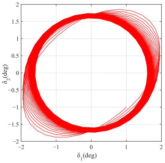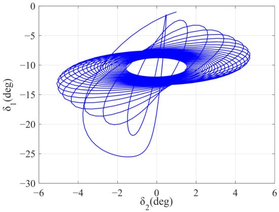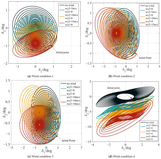 Similarly, the phase trajectory projection sequence is used as the analysis method. The simulation initial values of the nonlinear angular motion system equation are the same as those in Section 4.1. Based on the wind speed range at feature point 2, strong wind conditions and are taken, and the simulation results are shown in Figure 10.