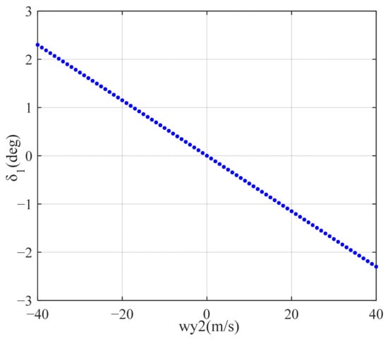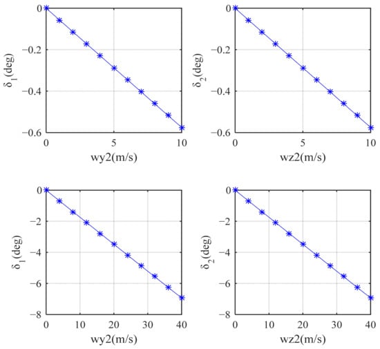 From Figure 4, it can be seen that the effect of wind on the position of the equilibrium point of the angular motion is basically linear with the magnitude of the wind speed under the consideration of geometric nonlinearity only. Further, the stability of the nonlinear angular motion equilibrium point of the projectile after being perturbed by wind is analyzed. Since the form of Equation (17) is complicated and the analytical form of the equilibrium point cannot be obtained directly, the position of the equilibrium point of the angular motion is obtained by numerical computation according to Lyapunov’s first approximation theory, and then the Jacobian matrix of the angular motion system corresponding to this point is computed, and the eigenvalues of the Jacobian matrix are utilized to carry out the stability analysis [32]. For feature point 1 and feature point 2, the maximum wind speed value of 40 m/s in the equilibrium curve of Figure 3 is taken, and the eigenvalues of the Jacobian matrix at the equilibrium point of the angular motion are calculated under different wind conditions, as shown in Table 3.