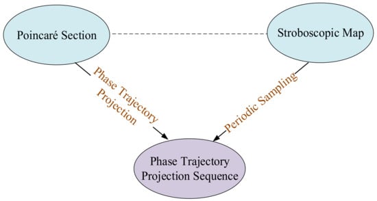 For the above problems, a phase trajectory projection sequence method for analyzing the variation in nonlinear system states with parameters is proposed in this section. This method combines the phase trajectory projection in the Poincaré section with periodic sampling in the Stroboscopic map, as shown in Figure 5. The main idea is to perform flicker sampling on the system state variables corresponding to a certain parameter condition when different values are taken and form a sampling sequence according to the increasing order of the parameters to reflect the changes of the system state with the parameters. Through this method, a curve of the system state with the system parameters is formed. The specific steps are as follows: