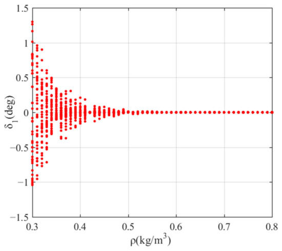 Based on the method in Section 4.2, the air density , which characterizes the influence of the flight environment, is selected as the bifurcation analysis parameter, and is selected as the projected state quantity of the phase trajectory sequence at feature point 1. The phase trajectory projection sequence diagram of the nonlinear angular motion of the dual-spin rocket is computed.