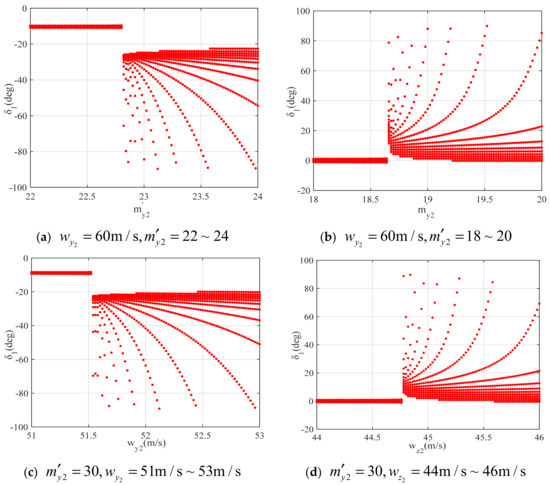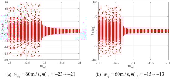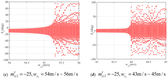 From Figure 10a,b, it can be seen that under strong wind conditions, when the derivative of the cubic-term static moment coefficient exceeds the critical value, the amplitude of the attack angle of the dual-spin rocket increases rapidly, leading to divergence and an instability of angular motion. Under the same wind speed condition, the critical value of corresponding to is about 22.78, which is larger than the critical value of corresponding to , which is 18.66. Fixing the value of the derivative of the static moment coefficient of the cubic term to 30, we calculate the projection sequence of angular motion phase trajectories using the vertical wind and as parameters, respectively, as shown in Figure 10c,d. Comparing Figure 10c,d with Figure 10a,b, similar conclusions can be obtained: when is the same, the critical value of that causes the angular motion destabilization is larger than that of , and they are about 51.53 m/s and 44.77 m/s, respectively. It can be seen that is more prone to cause the angular motion destabilization of the dual-spin rocket in the case of strong winds and nonlinearity of the static moment.