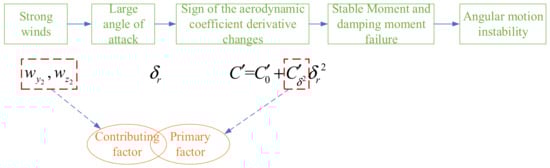 It can be seen that, due to the strong wind, the projectile produces a larger amplitude of angle of attack oscillation; the oscillation amplitude is about 25.49 °, very close to the value of ; at this time, if the wind speed or the derivative of the coefficient of the static moment of the cubic term is further increased, then the situation of will occur. The above analysis also applies to the case corresponding to the nonlinear equatorial damping moment. Based on the above analysis, the destabilization of the angular motion of the dual-spin rocket caused by strong wind and nonlinear aerodynamics can be summarized in Figure 13.
