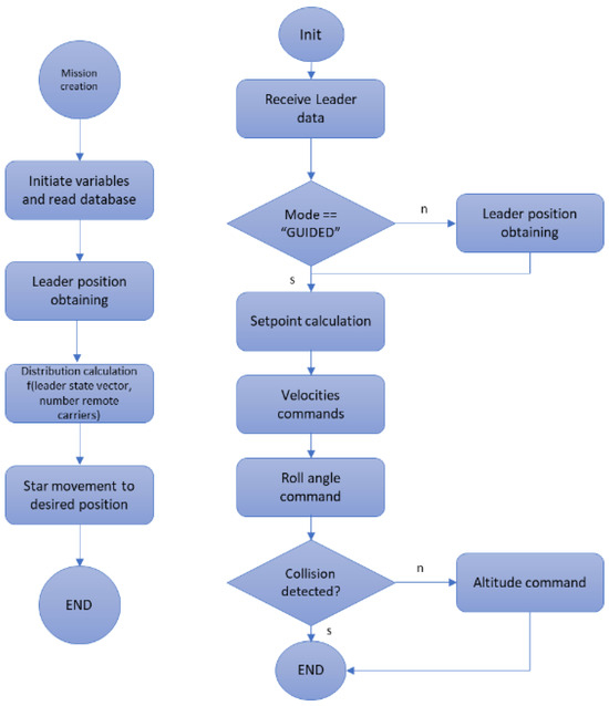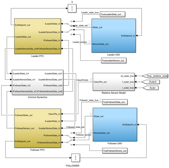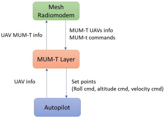 Additionally, the proposed system is architected with modularity and platform agnosticism in mind. The relative navigation and control framework is intentionally designed not to be tightly coupled to any specific aircraft model or sensor configuration. Instead, it supports generalization across heterogeneous aerial platforms with different dynamic characteristics. This abstraction of vehicle-specific dynamics enables broader applicability of the system, facilitating its integration into collaborative MUM-T operations across diverse mission profiles. To further enhance its flexibility, the system has been implemented in a way that allows it to function as a high-level control layer on top of standard autopilot systems commonly used in UAVs, such as ArduPilot in this case, as can be seen in Figure 2. This approach simplifies integration efforts and ensures compatibility with existing flight control architectures.