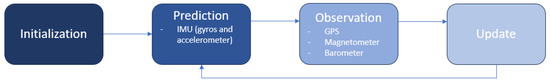 The different sensor sampling rates have to be taken into account, thereby occurring sequentially, and is used when GPS measurement is available, whereas is taken into account when magnetometer and pressure observations are available.