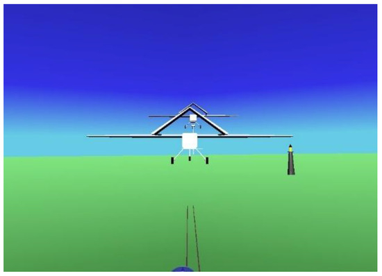 - Second, a relative state estimator on the leader or tanker aircraft uses visual PnP-based measurements (e.g., using POSIT [20]) combined with the state vectors of both vehicles to infer relative pose. The POSIT (Pose from Orthography and Scaling with Iterations) algorithm was employed to estimate the three-dimensional pose of known rigid objects from single monocular images. This method assumes that the intrinsic parameters of the camera are known and relies on a set of 2D-3D correspondences between image features and predefined object landmarks. POSIT initially approximates the object pose using a scaled orthographic projection, which simplifies the computation. It then iteratively refines the solution by updating the estimated depths of the 3D points, progressively converging toward a more accurate perspective pose. Due to its computational efficiency and robustness in real-time scenarios, POSIT was particularly suitable for the visual tracking and spatial estimation tasks addressed in this work.