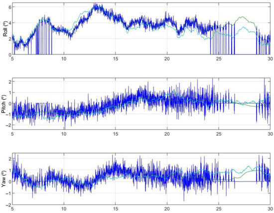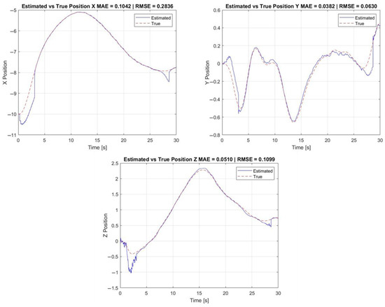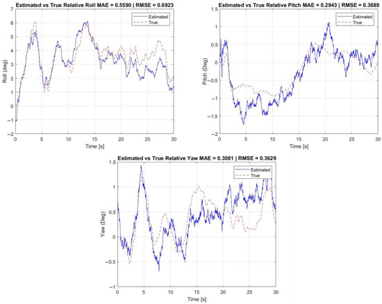 In terms of computational performance, the UKF remains feasible for real-time execution onboard aerial platforms. For instance, ref. [19] demonstrated that the UKF could be implemented efficiently for spacecraft attitude estimation with update rates exceeding 50 Hz using state vectors of similar size to those used in this work. More recent benchmarking studies, such as [41], report average execution times below 1 ms per cycle for UKF implementations with 15–20 state variables on embedded platforms, including ARM Cortex-M7 and STM32H7 microcontrollers. Although the UKF is more computationally demanding than the EKF due to the propagation of sigma points, this overhead is offset by its superior numerical stability and estimation accuracy in nonlinear attitude estimation problems.