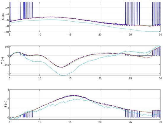 where is the GPS-based position estimation, is the GPS-based velocity estimation, is the predicted position, is the rotation matrix from the body frame to the navigation frame, is the position of the GPS antenna relative to the center of gravity, and are the measurement noise terms for the GPS position and velocity, respectively. is the predicted velocity, and is the skew–symmetric matrix of angular velocity.