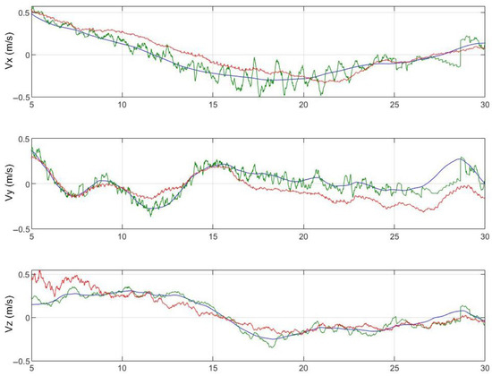 where is the position vector in the NED (North–East–Down) navigation frame, V is the velocity vector in the NED frame, q is the unit quaternion representing the orientation of the body frame with respect to NED, is the gyro bias, and is the accelerometer bias. In the notation used throughout this work, a dot above a variable denotes its time derivative, that is, the rate of change in the variable with respect to time. This convention is standard in dynamic systems modeling and is applied consistently to represent the evolution of state variables such as position, velocity, attitude, and sensor biases.