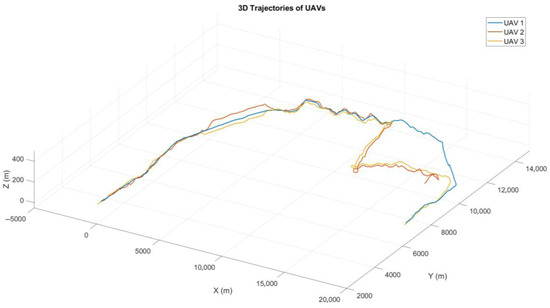 Table 7 presents the results of a detailed pairwise analysis of UAV trajectories, focusing on proximity and heading convergence as indicators of potential collision risk. The dataset evaluates key metrics for three UAV pairs: UAV 1–2, UAV 1–3, and UAV 2–3. In all experiments, UAV 1 is designated as the leader, and the relative estimation is performed from the perspective of UAV 2 (wingman). The notation “UAV 1–2” therefore indicates an estimation of UAV 2’s state relative to UAV 1.