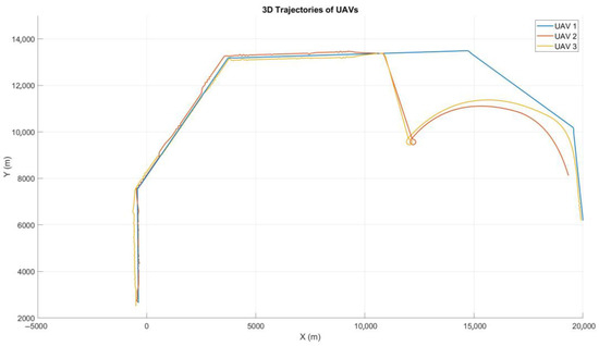 The following Figure 25 and Figure 26 show the different trajectories of the fighter and the remote carriers during various formation types, including Arrow, Line, and Z formations. It also illustrates the re-tasking of the two remote carriers as they temporarily leave the formation to execute a mission, followed by their subsequent regrouping with the fighter.