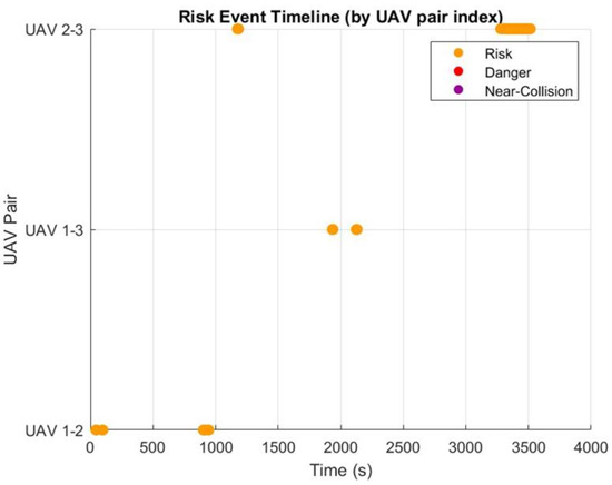 Pair UAV 1–2 reached a minimum separation of 34.77 m, triggering 61 risk events. These events accumulated a total of 30.17 s, corresponding to 0.51% of the total mission time. Additionally, 22 critical converging events were detected, with a cumulative duration of 10.88 s (0.18% of the mission time). No danger or near-collision events were recorded, indicating that although frequent, these interactions were not severe in nature.