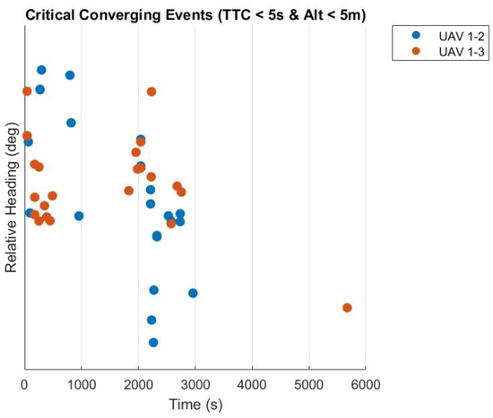 Pair UAV 1–3 experienced slightly closer interactions, with a minimum distance of 29.35 m. A total of 30 risk events were logged, lasting 14.84 s (0.25% of the mission). Despite the reduced event count, the number of critical converging events was higher than in UAV 1–2 (23 events, lasting 11.38 s, or 0.19% of the mission), suggesting more alignment in velocity vectors during close encounters.