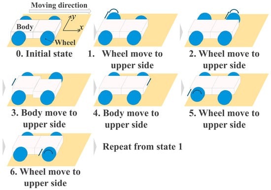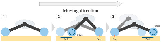 To improve the mobility performance of wheeled rovers, a wide range of studies have been conducted. For example, Scrab and Sherpa have improved their mobility by adding new functions to their conventional driving mechanisms [6,7]. In addition to normal driving, they can perform discrete movements by extending or contracting their wheelbase using joint actuators, as shown in Figure 1. By alternately fixing the front or rear wheels and driving the other, the rover moves forward through wheelbase contraction and extension, gaining greater ground reaction force and improved mobility. This movement resembles that of an inchworm and is called push-pull locomotion (PPL) in this paper.