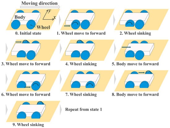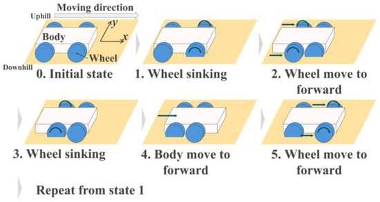 In our research group, we analyzed the relationship between wheel sinkage and resistance force, as well as the mechanism of traction force generation in a PPL-type rover. Based on this, we proposed Advanced Push-Pull Locomotion (APPL), which incorporates intentional wheel sinkage through wheel spinning into the PPL mechanism. This increases the contact area with the ground and enhances resistance force, enabling greater traction during wheelbase extension and retraction. APPL has been shown to improve slope climbing ability [8]. Figure 2 shows the APPL method. To further enhance slope traversal, 4-Wheel APPL (4WAPPL) was proposed, allowing each wheel to move independently while the others remain stationary. By enabling independent wheel motion, 4WAPPL increases the resistance force achieved with the APPL method [9]. The sequence of 4WAPPL is shown in Figure 3.