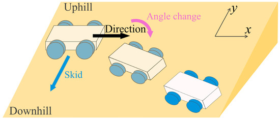 When a wheeled rover traverses a slope, as shown in Figure 4, sideslip could occur. The primary causes of this are ground collapse and a loss of attitude angle. First, the ground around the wheels could collapse while driving, preventing the wheels from obtaining sufficient resistance force, which causes the entire rover to slip down toward the valley side of the slope. In addition, due to gravity, the rover’s attitude angle gradually shifts toward the valley side. This not only increases the risk of the rover tipping over but also leads to deviation from the intended path. To address these issues, previous studies have proposed sideslip prevention methods using APPL or 4WAPPL. For example, one approach directs the driving force toward the uphill side by adjusting the steering angle and utilizing a high-slip state of the wheels [10]. These methods inhibit sideslip and attitude angle change by increasing the wheel sinkage or by redirecting the total driving force vector of the wheels. While the Push-Pull Locomotion method has demonstrated effectiveness in reducing the risk of sideslip during slope traversal, prior studies have predominantly focused on the prevention of sideslip. In contrast, recovery methods to restore the rover’s attitude or trajectory after sideslip has already occurred have not been sufficiently explored. Given that complete prevention of sideslip is often impractical in real-world environments, especially on steep or deformable terrain, the development of recovery mechanisms after sideslip is essential to enhance the robustness and reliability of rover mobility systems.