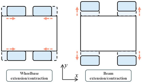 The typical method for recovering from sideslip is turning. This approach rotates the rover’s orientation from facing downhill to uphill by steering or by controlling the differential rotation of the left and right wheels. However, turning on the soft slope can easily lead to ground collapse and further sideslip. To address this issue, this study proposes a method that moves the rover directly toward the uphill side of the slope. The key features of this method are its high path-following performance and simplicity of control. By basing the recovery motion on direct movement toward the uphill side, this method does not require complex control algorithms or kinematic computations, enabling a simpler recovery process. Consequently, this approach is expected to recover without turning and reduce the risk of further deviation from the intended path. In this study, the term two-dimensional Push-pull Locomotion (2DPPL) refers to a locomotion method that enables the rover to move not only in the longitudinal (forward/backward) direction via wheelbase extension and contraction but also laterally (left/right) using beam extension and contraction mechanisms, as illustrated in Figure 5. The designation “two-dimensional” highlights that mobility is not confined to a single axis but instead encompasses two translational degrees of freedom on the slope surface. The objective of this research is to suppress sideslip and reduce attitude angle loss during slope traversal.