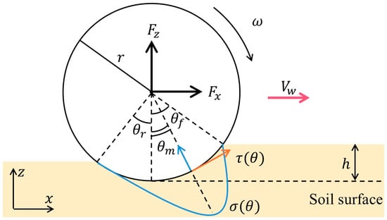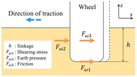 Next, the wheel-soil interaction model is illustrated in Figure 6. By applying Equation (1) to the wheel and substituting the wheel sinkage