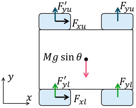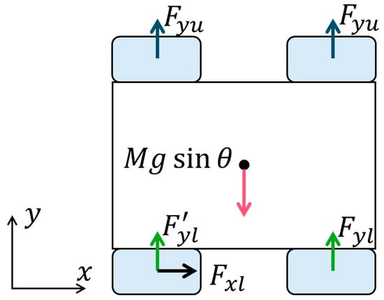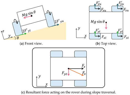 We analyze the forces generated during normal driving and APPL driving while traversing a slope. First, when the rover is stationary on the slope, the forces acting along each axis are balanced, as illustrated in Figure 8. Since the loads on the uphill and downhill sides of the slope differ, the ground reaction forces can be denoted as