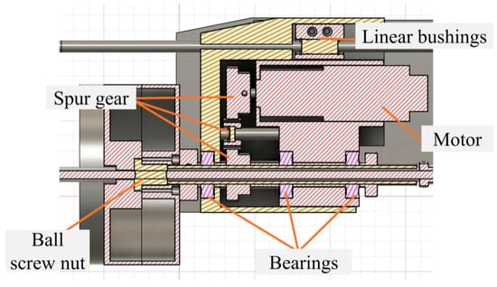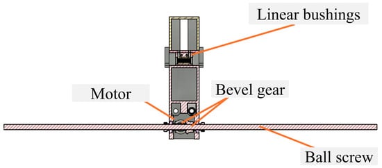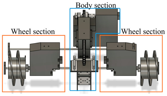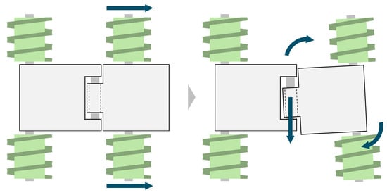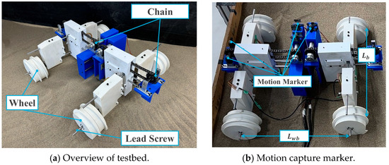 Figure 12 illustrates the proposed beam extension and contraction method. In this method, the distance between the left and right wheels (beam) can be extended or contracted. Specifically, the rotational motion of the wheels is converted into linear motion along the axis by connecting the left and right wheels via a ball screw. Each wheel and body is controlled independently. When one wheel moves uphill, the remaining three wheels remain stationary, allowing effective use of shear force from the ground. As discussed in Section 2.3, increasing the number of stationary wheels enhances ground reaction forces and reduces the likelihood of skidding. Furthermore, since the rover can move laterally without changing its orientation, steering operations and yaw-axis rotations can be avoided. This ability to move directly uphill is particularly effective for correcting sideslip and maintaining a stable attitude angle.