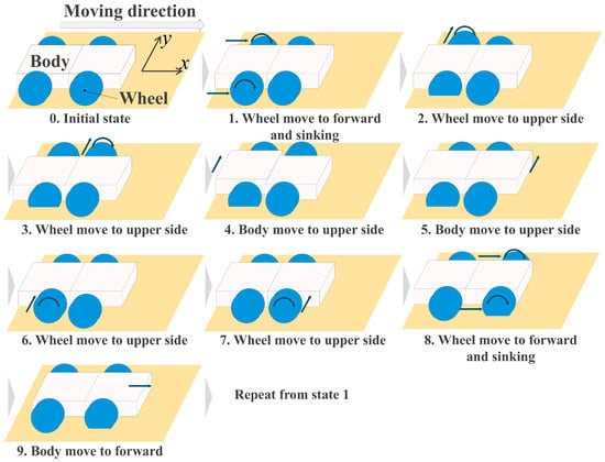 Next, Figure 9 presents a schematic diagram of the rover at the onset of normal driving. On soft terrain, the ground is more prone to collapse than on rigid terrain, leading to a reduction in the ground reaction forces