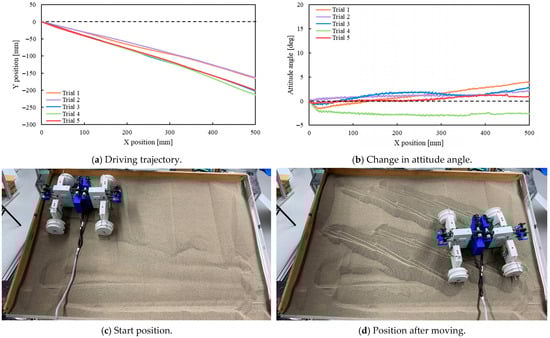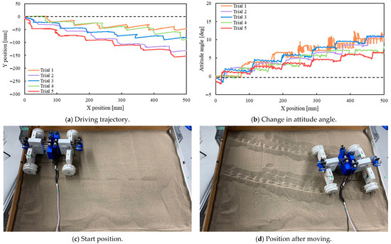 Changes in attitude angle were also identified as a key factor in suppressing sideslip. In all driving methods, the rover maintained its attitude without tilting toward the downhill side. However, during APPL and 2DPPL driving, a noticeable tilt toward the uphill side was observed. This may be due to the screw-shaped wheels and the lateral soil displacement caused by wheelbase and beam extension/contraction. Specifically, since the wheels are designed as right-handed screws, soil tends to accumulate on the downhill side during rotation, resulting in an uphill moment that tilts the rover.